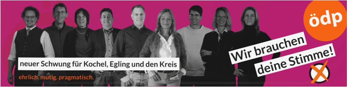 Für die kommende Legislaturperiode stehen die drei Themen Bildung, Mobilität und Energiewende ganz oben auf unserem Programm, aber für viele vielleicht überraschend anders. Lesen Sie sich unser Kommunalwahlprogramm durch, treten Sie mit uns in Kontakt auf unseren Veranstaltungen oder auch per Mail und gehen Sie mit uns ins Gespräch. Am Ednde geben Sie uns bitte am 8. März Ihre Stimme für den Kreistag, für den Gemeinderat in Kochel und Egling und für unseren Landratskandidaten Manuel Tessun. Herzlichen Dank!